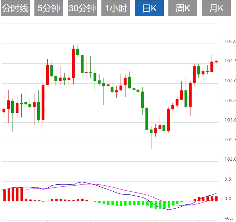 美元指数:截止发稿,美元指数上涨0.01%,现报104.56。本周的亮点将是将于周五公布的总体个人消费支出(PCE),预计将同比增长2.5%,而核心指标预计将达到2.8%。美联储首选的通胀指标的结果将决定美元在短期内的步伐。相对强弱指数 (RSI) 在 60 附近小幅上涨,而移动平均收敛散度 (MACD) 显示绿色条,表明存在看涨势头。然而,目前的买盘牵引力能否将美元指数推高至更高水平还有待观察,因为MACD也暗示上涨潜力有限。