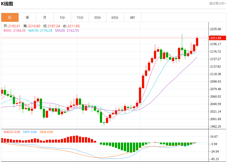 现货黄金:截止北京时间20:25,现货黄金上涨,现报2211.52,涨幅0.77%。纽市盘前,金价显示新的积极交易触及2200.00美元关口,等待更多上涨至代表我们下一个主要目标的2222.86美元。