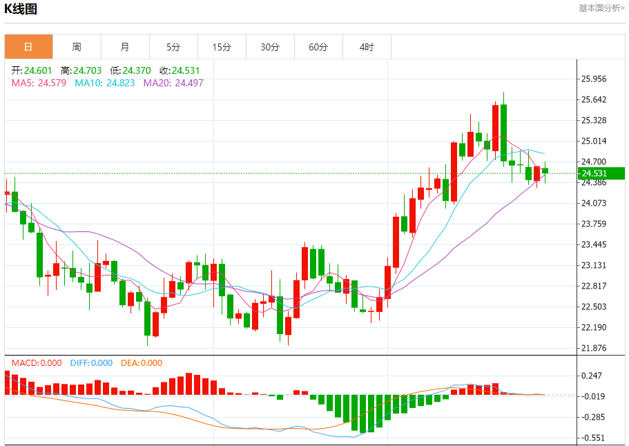 现货白银:截止北京时间20:25,现货白银下跌,现报24.532,跌幅0.39%。纽市盘前,白银价格面临测试关键支撑位24.30美元的预期负面压力,同时我们仍在监控价格并等待通过突破上述支撑位或突破24.85美元阻力位来获得下一趋势的更清晰信号,以保持我们的中立态度直到现在。