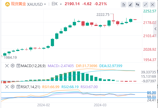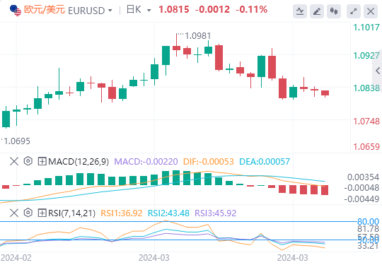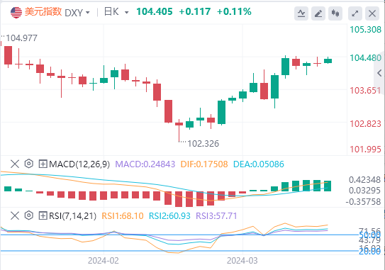 美元指数:截止发稿,美元指数交投于103.405附近。美美联储上周似乎不那么激进,对预计将于6月开始的宽松周期采取了谨慎的态度。这一立场是在上调通胀预测以及主席杰罗姆·鲍威尔保证央行将避免对两个月的高通胀数据反应过度之后做出的。然而,美元设法收复了美联储后的所有损失,主要是因为美国经济保持弹性。技术面上,相对强弱指数(RSI)目前反映出处于正值区域的持平位置,这表明购买压力稳定。移动平均收敛散度(MACD)显示平坦的绿色条,表明购买势头保持不变。此外,该指数位于其20、100和200天简单移动平均线(SMA)上方,证实了长期看涨偏见。