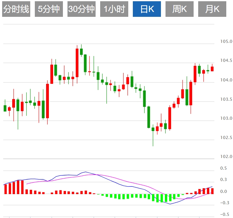 美元指数:截止发稿,美元指数上涨0.11%,现报104.41。美元指数上涨,投资者似乎处于观望状态,因为他们正在等待新的驱动因素将赌注押在美联储(Fed)宽松周期的时机上。美国经济数据方面,投资人将关注2023年最后一季的国内生产毛额数据、美国上周初请失业金人数以及美联储看重的通胀指标核心PCE物价指数。技术上,相对强弱指数 (RSI) 目前反映出处于正值区域的持平位置,这表明购买压力稳定。移动平均收敛散度 (MACD) 显示平坦的绿色条,表明购买势头保持不变。此外,该指数位于其 20、100 和 200 天简单移动平均线 (SMA) 上方,证实了长期看涨偏见。