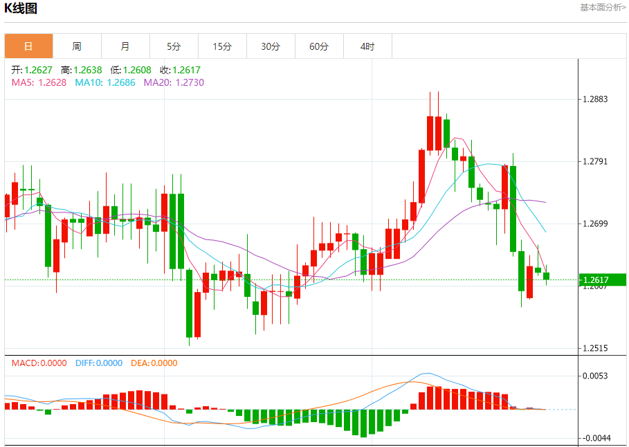 英镑/美元:截止北京时间20:25,英镑/美元下跌,现报1.2618,跌幅0.08%。纽市盘前,GBPUSD价格接近1.2600美元关口,受随机利好影响,现在显示出一些轻微的看涨迹象。等待恢复预期的熊市波今天,这是由先前完成的双顶模式影响。