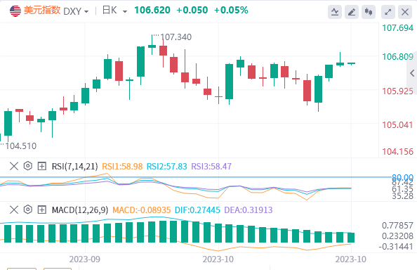 10月27日,周五亚市盘中,美元指数在106.63死守多头,美国国内生产总值(GDP)、耐用品数据和每周初请失业金人数均高于预期。尽管数据强劲,但美国债券收益率和对美联储的鹰派押注均下降,阻碍了美元继续走高。黄金回调后反弹至1982美元,以色列大军连夜突袭加沙,伊朗警告将向美国发起反击。