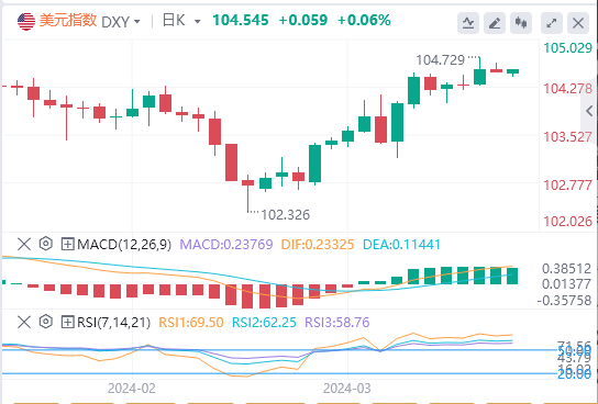 上周五,美元指数运行在104关口上方,盘中一度冲上104.67的日内高点,而后回吐日内大部分涨幅,最终收跌0.05%,报104.48。截至目前,美元报价104.545。