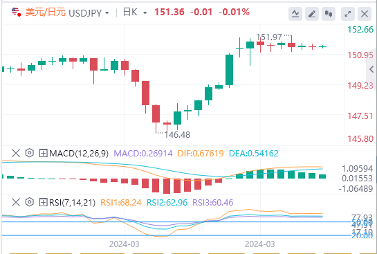 美元/日元周一早盘继续在151.50下方横盘震荡。日本财务大臣铃木淳一(ShunichiSuzuki)当天早些时候进行了一些口头干预,称近期日元疲软的背后是投机行为,并补充说不排除采取任何措施应对无序的外汇走势。