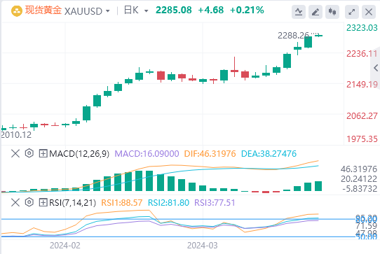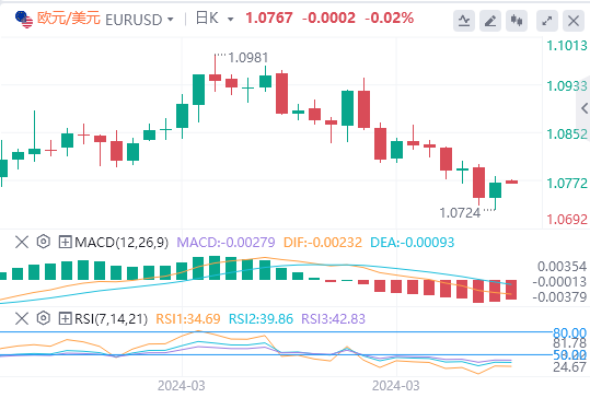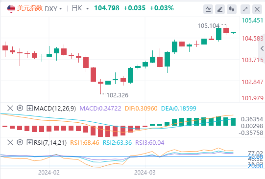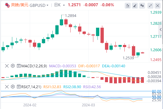 美元指数:截止发稿,美元指数交投于104.79附近。许多美联储(Fed)官员的鸽派言论令美元承压。克利夫兰联储主席梅斯特(LorettaMester)周二表示,她预计今年会降息,但排除了5月份的下一次政策会议的可能性。与此同时,旧金山联储主席玛丽·戴利(MaryDaly)表示,她认为2024年降息三次似乎是“合理的”,但她需要更令人信服的证据来证实这一点。期货交易员预计,美联储将在6月的会议上开始宽松政策,并在年底前降息四分之三个百分点。技术面上,相对强弱指数(RSI)处于负斜率,但仍处于正值区域,这意味着买盘势头可能减弱。这可能暗示多头在将该指数推至2月中旬以来的最高水平后,此时正在喘口气。移动平均收敛散度(MACD)显示绿柱线减少,进一步表明看涨势头似乎正在失去动力。