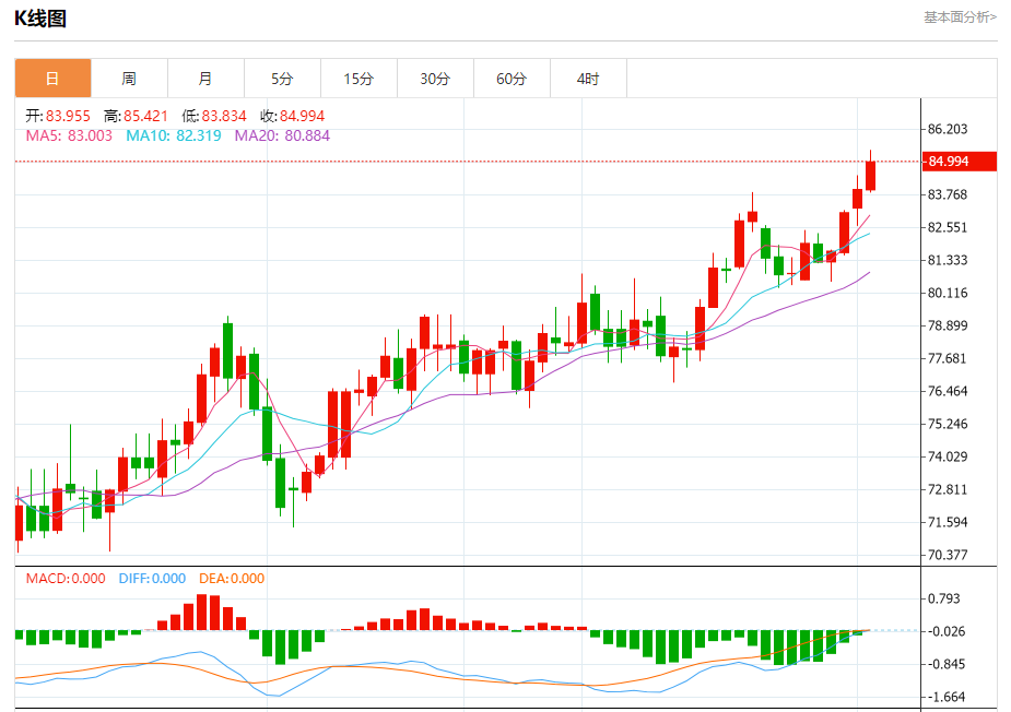 原油市场:截止北京时间20:24,美油上涨,现报84.956,涨幅1.16%。纽市盘前,原油价格成功实现了我们第一次等待的85.00美元的目标,并以额外的积极交易超过了这一水平,并在盘中和短期基础上确认了牛市的持续,并正在实现新的收益,达到86.75美元。
