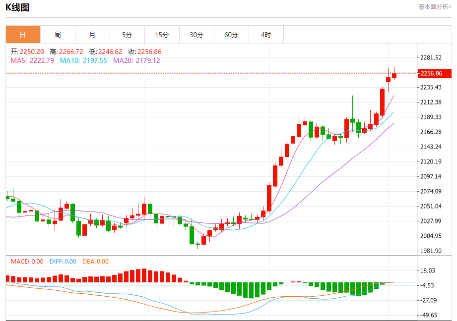现货黄金:截止北京时间20:24,现货黄金上涨,现报2256.33,涨幅0.23%。纽市盘前,黄金价格恢复积极交易,开始尝试突破2260.00美元,这支持了未来一段时间的预期看涨趋势,其下一个主要目标位于2300.00美元。