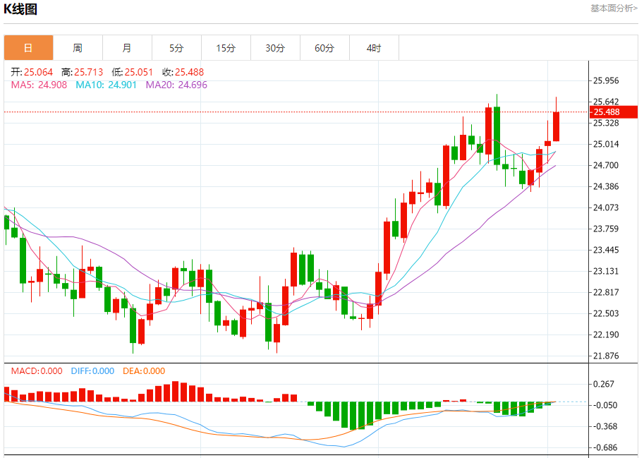 现货白银:截止北京时间20:24,现货白银上涨,现报25.487,涨幅1.71%。纽市盘前,白银价格强劲上涨,成功实现了我们在25.50美元的第一个目标,并突破了这一目标,确认了看涨趋势的持续,为我们在26.07美元的净目标开辟了道路。