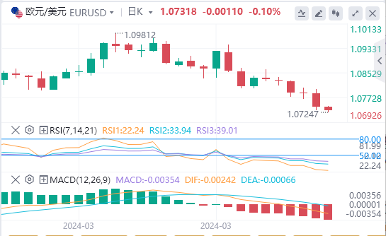 欧元/美元周一跌破1.0800,日内下跌近0.5%。该货币对保持劣势,在欧洲早盘跌破1.0750的负值区域交易。
