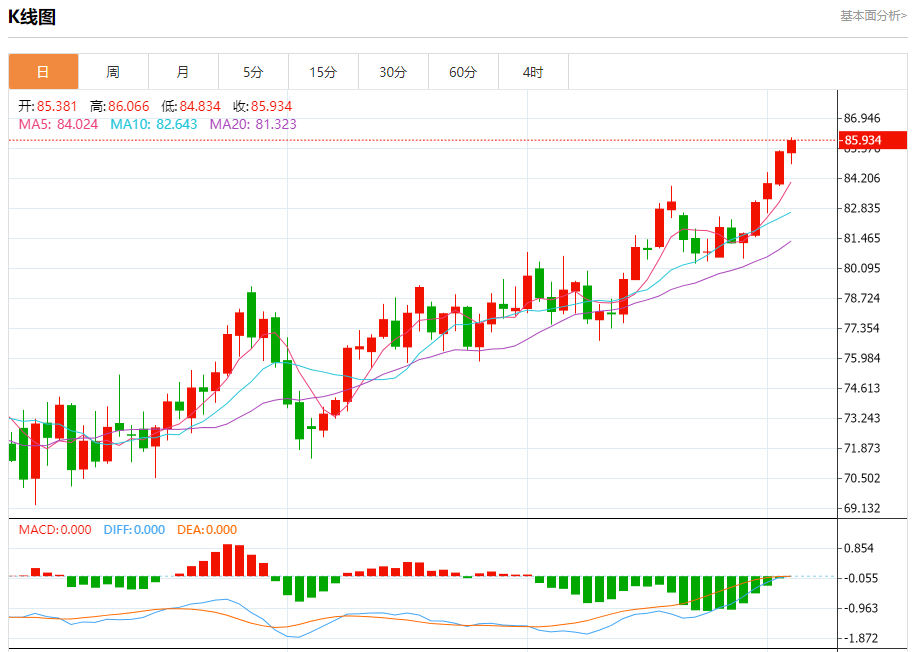 原油市场:截止北京时间20:26,美油上涨,现报85.939,涨幅0.60%。纽市盘前,原油价格从早上开始横盘交易,现在开始试图上涨,暗示将恢复主要的看涨趋势,保持今天积极的局面,受到EMA50的支持。需要注意的是,我们的下一个目标位于86.75美元。