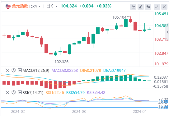上周五,由于超预期的非农数据打压了市场对美联储的降息预期,美元指数短线跳涨,但于美股开盘后迅速回吐涨幅,截至目前,美元报价104.324。