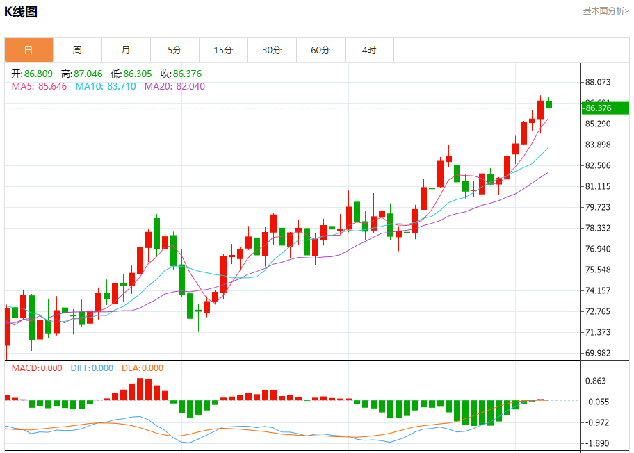 原油市场:截止北京时间20:21,美油下跌,现报86.385,跌幅0.51%。纽市盘前,原油价格从早上开始横盘。停留在87.00美元水平附近,等待聚集积极势头以恢复主要看涨趋势。目标是89.40美元的地区作为下一个主站。