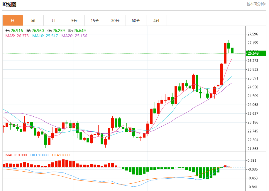 现货白银:截止北京时间20:21,现货白银下跌,现报26.627,跌幅0.96%。纽市盘前,在前几个交易日,银价面临强大的负面压力。突破26.80美元水平并到达26.30美元区域暗示着潜在的下跌趋势。