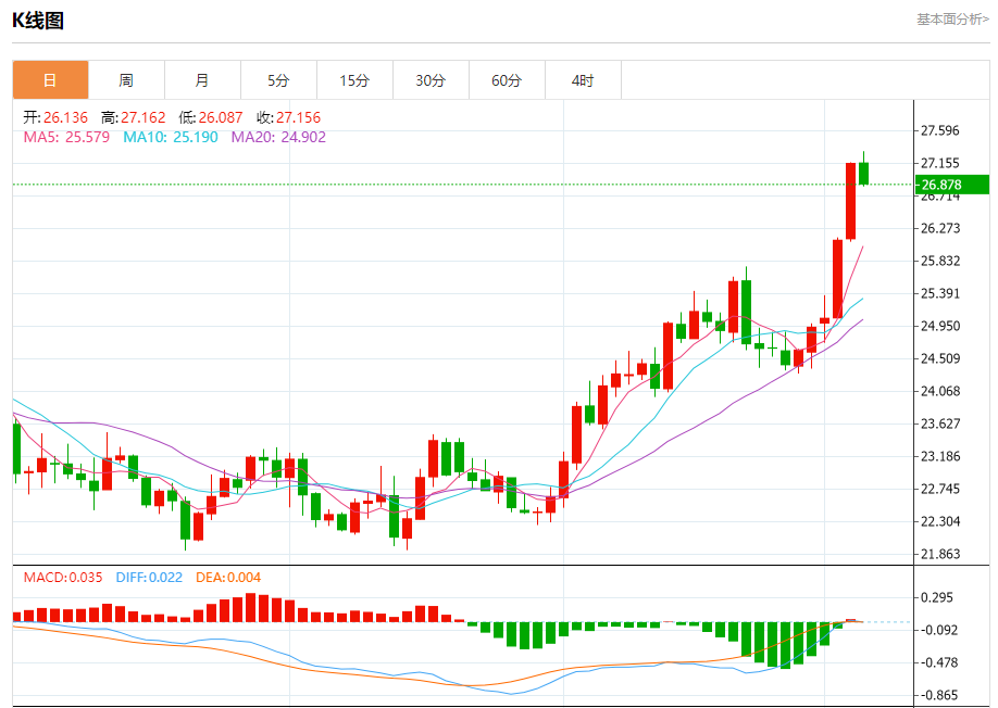 现货白银:截止北京时间20:21,现货白银下跌,现报26.884,跌幅1.00%。纽市盘前,银价面临利空压力,显示出暂时的看跌倾向,因为随机利空解释了当前下跌的原因。但只要价格高于26.65美元的支撑位,我们的看涨观点将保持有效和活跃,目标是28.00美元区域作为下一个主站。