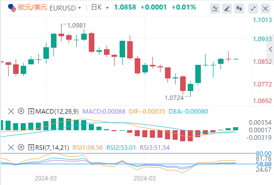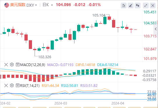 美元指数:截止发稿,美元指数交投于104.098附近。美元指数周二几乎持平,投资者在美国消费者物价指数(CPI)报告出炉前保持谨慎。与此同时,日元兑美元持续徘徊在数十年低点附近,这让交易员对日本当局可能采取的任何行动保持警惕。技术面上,美元日线图上,相对强弱指数(RSI)的静态位置表明动能呈中性,而移动平均收敛分歧(MACD)柱状图中出现新的红色条则表明短期内动能可能转向看跌动能。