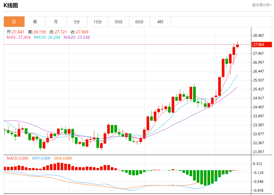 现货白银:截止北京时间20:25,现货白银上涨,现报27.964,涨幅0.49%。纽市盘前,白银价格显示新的积极交易超过28.00美元的障碍,并加强了继续看涨趋势的预期,等待访问28.75美元作为下一个主要目标。