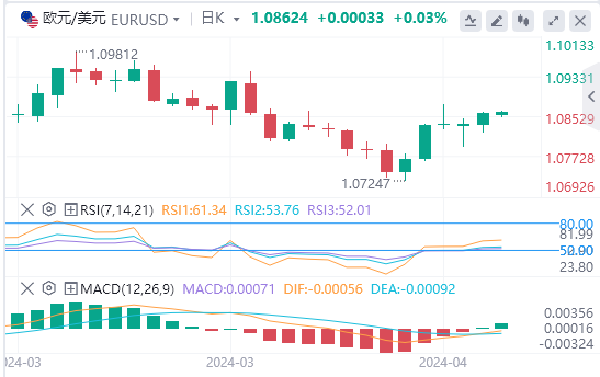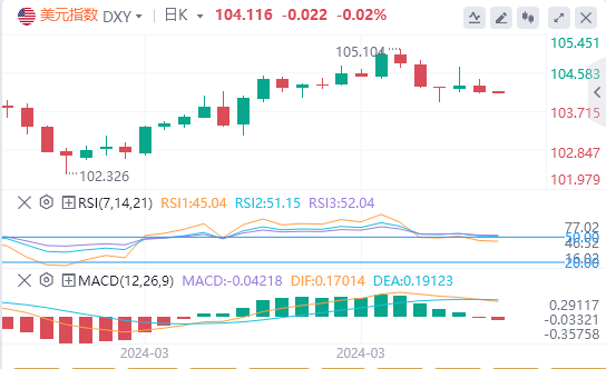 美元指数:截止发稿,美元指数交投于104.116附近。美国经济尚未显示出通胀和经济活动放缓的明确证据,这使得美联储开始降息。如果数据显示经济具有弹性,宽松预期有所调整,美元可能会进一步上行。技术面上,日线图上的指标反映了市场情绪的喜忧参半。相对强弱指数 (RSI) 的斜率为负,但保持在正值区域,表明市场参与者之间存在不确定性,并且缺乏坚定的方向性偏差。