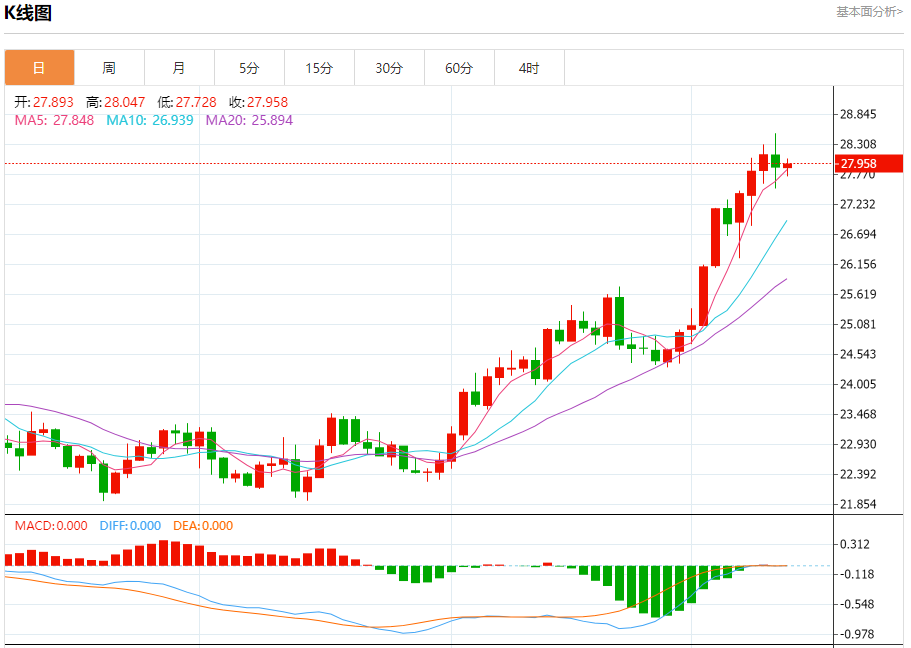 现货白银:截止北京时间20:24,现货白银上涨,现报27.984,涨幅0.30%。纽市盘前,白银价格再次在看涨通道的支撑线附近徘徊,注意到随机指标接近超卖区域,等待推动价格恢复今天的预期看涨趋势,其主要目标位于28.75美元,其次是29.40美元。