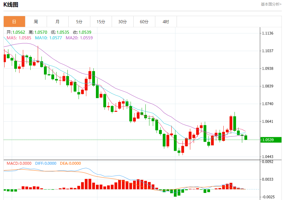 欧元/美元:截止北京时间20:22,欧元/美元下跌,现报1.0540,跌幅0.22%。纽市盘前,欧元兑美元在看涨通道的支撑线附近徘徊,随机指标负重叠,等待推动价格恢复今天预期的看跌趋势,目标是1.0448作为下一个主要位置。