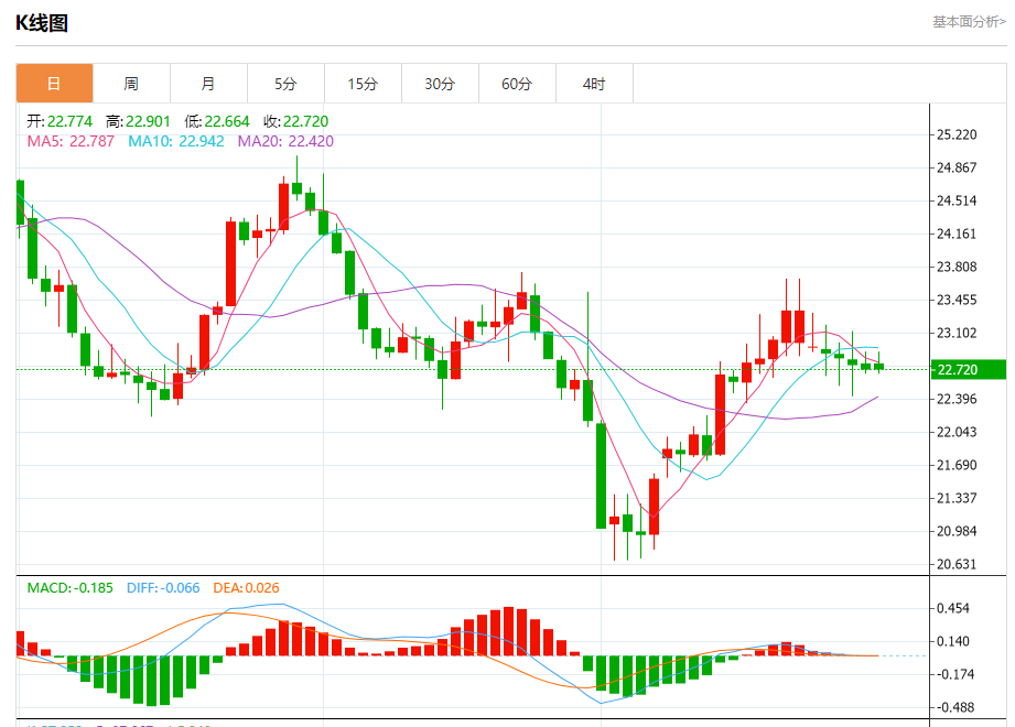 现货白银:截止北京时间20:22,现货白银下跌,现报22.749,跌幅0.08%。纽市盘前,银价在EMA50附近徘徊,随机指标再次失去积极势头,这形成了负面动机,我们预计将推动价格在今天剩余时间内恢复看跌倾向,提醒您我们主要等待的目标位于22.25。