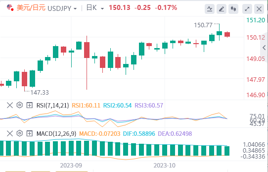 日元兑美元隔夜触及一年新低150.77,目前交投在150.15附近。这一汇率距离去年10月触及的30年低点151.94水平不远,当时正是这一水平促使日本当局干预外汇市场。