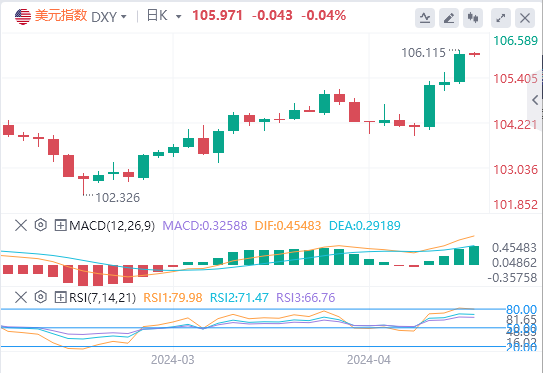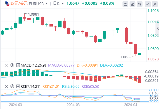 美元指数:截止发稿,美元指数交投于105.97附近。根据芝加哥商品交易所集团(CMEGroup)的美联储观察工具(FedWatchTool)测算,美联储在6月份启动宽松周期的概率已从3月份CPI数据公布前预期的60%大幅降至20%左右。与此同时,投资者已经开始预测美联储在9月份的会议上可能会降息25个基点。技术面上,日线图显示,11月高点107.11(11月1日)即将构成阻力区,然后是2023年高位107.34(10月3日)。下行方面,处在103.84的200日简单移动均线(SMA)可能会构成初步支撑,然后是位于103.47的临时100日均线和3月份低点102.35。如果美元指数进一步下跌,则可能逼近12月28日创下的12月低点100.61,然后是100.00临界水平和7月14日创下的2023年低点99.57。