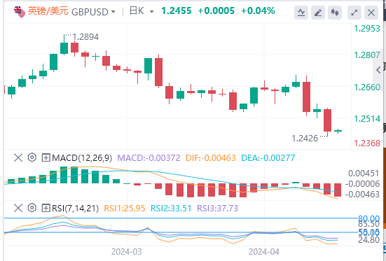 英镑:截止发稿,英镑/美元徘徊于1.2455附近。英镑/美元上周五下跌,收报1.2451,跌幅0.81%。最新的英国就业和通胀报告将于本周发布,背景是全球对降息预期的重新定价。市场已将英国首次降息推迟到9月19日的英国央行会议,尽管8月1日的会议仍在进行中,而几周前对6月降息的预测。技术面上,如果英镑走高,这些技术指标现在将成为阻力位。下一个支撑位在1.2381和1.2303。英镑/美元看起来超卖,这可能会在短期内缓和任何进一步的大幅抛售。