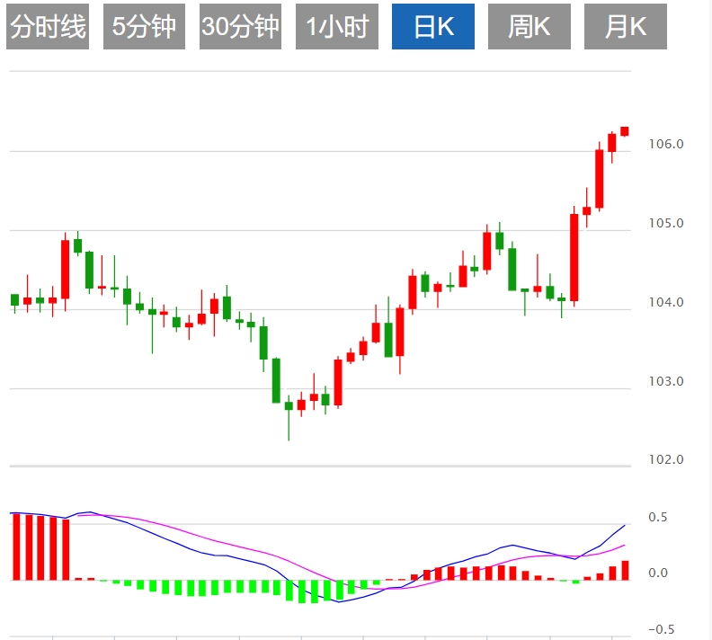 美元指数:截止发稿,美元指数现报106.27,日内上涨0.06%。美元指数(DXY)周一在106.05附近走高,略低于上周触及的峰值106.10。强劲的经济数据继续有利于美联储的鹰派言论,美元受益于美国国债收益率上升。以色列和伊朗之间的紧张局势也助长了谨慎的市场情绪,这往往有利于美元。技术上,日线图上的技术指标通过相对强弱指数(RSI)反映超买情况。这意味着买家最近一直占据主导地位,推高了 DXY 的价值。然而,如果买家筋疲力尽,这通常可以在修正之前进行。