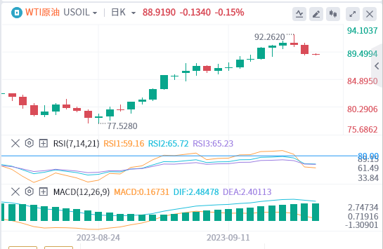 技术面:WTI 美国原油较当日高点下跌了 2%,现价为每桶 89.00 美元。原油略微偏离 92.25 美元附近的近期高点,200 小时简单移动均线(SMA)目前构成支撑,这将阻止原油进一步下跌。日线蜡烛图显示,WTI油价看起来超买得令人难以置信,相对强弱指标和MACD指标均处在上侧,显示WTI油价可能会出现整理。WTI油价最新突破上升三角形,将在 84.00 美元上方获得支撑,34 天指数移动均线向上攀升,也将构成动态支撑。
