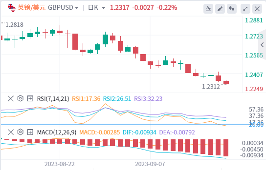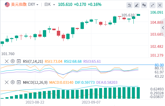 美元指数:截止发稿,美元指数交投于105.61附近。在美联储一致决定将利率维持在5.25-5.50%不变后,美元指数从60.105跃升至40.105附近的近期高点。美国政府关门的可能性正在增加。为了避免10月份的停摆,立法需要在本周末之前通过。技术面上,RSI技术指标向上运行。在105.05之上,看涨,目标价位为105.60,然后为105.80。