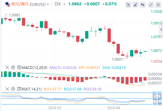 美元指数:截止发稿,美元指数交投于106.052附近。美联储政策方面,芝加哥商品交易所美联储观察工具显示,美联储在6月份启动宽松周期的概率已大幅下降至约16%,而对9月份首次降息的预期则升至65%以上。除了通胀持续高企之外,必须强调的是,持续紧缩的劳动力市场强化市场对经济强劲的看法,支持了“经济软着陆”的前景,并暗示美联储启动降息的预期时间将推迟技术面上,如果多头继续走强,美元指数可能会触及2024年高点106.51(4月16日)。若突破该水平,可能会提振美元指数在触及2023年最高点107.34(10月3日)之前,开始可能会测试11月份最高点107.11(11月1日)。