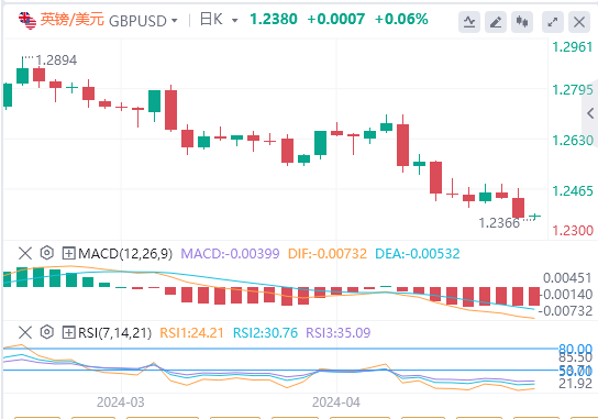欧元:截止发稿,欧元/美元徘徊于1.0662附近。欧元/美元上周五上涨,收报1.0655,涨幅0.11%。欧洲央行的利率制定者们更加坚信,在夏季(6月)事实上,欧洲央行董事会成员罗伯特-霍尔兹曼(RobertHolzmann)以欧洲和美国通胀状况不同为由,警告不要过早猜测2024年降息的前景。欧洲央行执行董事会成员皮埃罗-西波隆表示,预计明年将重返2%的轨道,并在2025年中期实现目标。如果6月和7月的数据证实了这一点,可能会考虑在2024年放宽限制性措施。技术面上,汇价上行的初步阻力位于1.0675,进一步阻力位于1.0707,关键阻力位于1.0724;汇价下行的初步支撑位于1.0626,进一步支撑位于1.0609,更关键支撑位于1.0577。