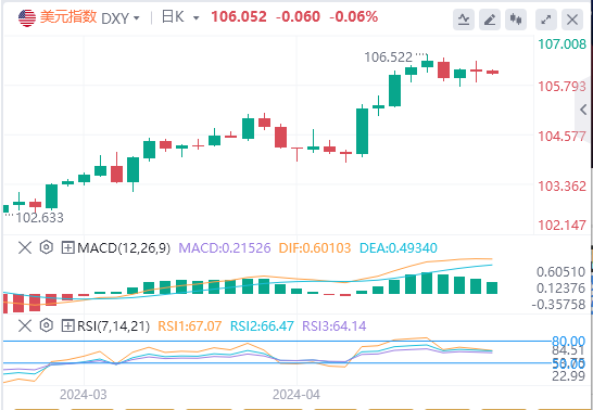 4月22日,北京时间周一亚市早盘,美元指数徘徊在106.052附近。周五,美元指数维持下跌趋势,一度跌落106关口,但因中东地缘政治风险的升级加强了美元的看涨基调,美元指数于美盘回升,最终收跌0.08%,报106.12;10年期美债收益率在亚盘急跌,随后回升,截至收盘几乎收复日内所有跌势,最终收报4.623%。对美联储政策利率最敏感的2年期美债收益率收报4.997%。因伊以局势加强避险情绪,现货黄金一度上破2410美元关口,但随着美联储降息预期的减弱,以及各方淡化以色列袭击伊朗的影响,黄金涨幅有所回吐,最终收涨0.57%,报2391.77美元/盎司;现货白银最终收涨1.62%,报28.67美元/盎司。由于地缘局势紧张引发了原油供应中断的担忧,WTI原油一度大涨4%,在85关口遇阻后转跌,几乎回吐日内全部涨幅,最终收涨0.27%,报82.07美元/桶;布伦特原油收涨0.33%,报87.15美元/桶。