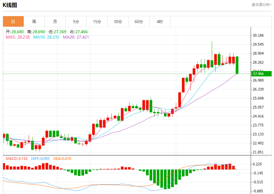 现货白银:截止北京时间20:22,现货白银下跌,现报27.464,跌幅4.16%。纽市盘前,白银价格明显突破28.00美元水平,并在过去四小时的烛台下方收盘,在即将到来的交易中承受预期的负面压力,目标是38.2%的斐波那契修正水平26.90美元作为下一个负面站。