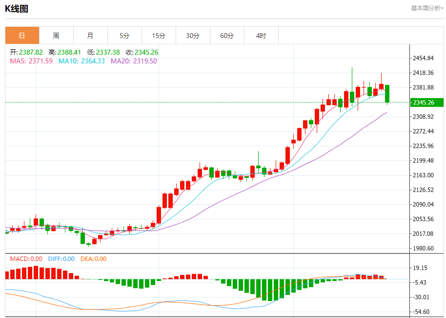 现货黄金:截止北京时间20:22,现货黄金下跌,现报2345.07,跌幅1.90%。纽市盘前,金价下跌至突破2365.10美元水平,并在当天剩余时间内继续下跌,目标是在接下来的交易中测试2325.90美元。