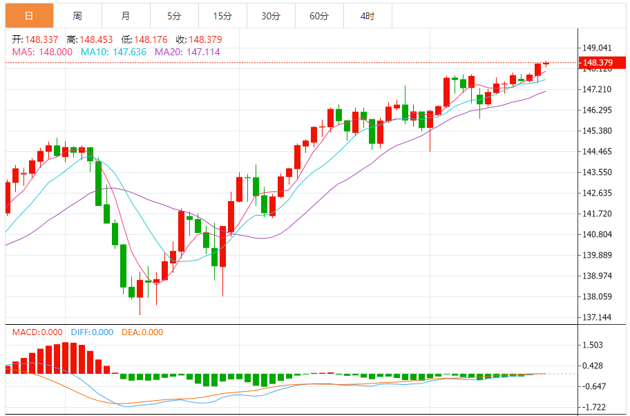 日元:美元/日元收高,收报148.342,涨幅0.33%。技术面上,汇价上行的初步阻力位于148.641,进一步阻力位148.949,关键阻力位于149.535;汇价下行的初步支撑位于147.747,进一步支撑位于147.161,更关键支撑位于146.853。