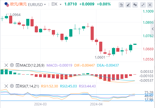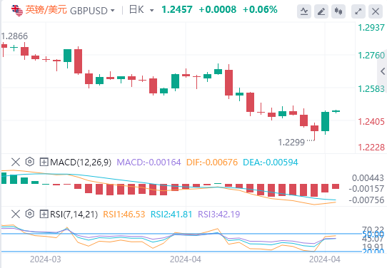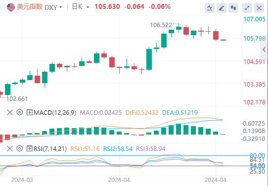 美元指数:截止发稿,美元指数交投于105.630附近。美联储(Fed)一直在发出一贯的鹰派信息,这可能会限制美元的跌幅,因为市场推迟了宽松周期的开始。投资者也在密切关注本周即将公布的重要经济报告,包括第一季度国内生产总值(GDP)增长率和3月份个人消费支出(PCE)物价指数的初步数据,以进一步了解经济健康状况。在周二的交易中,标准普尔采购经理人指数低于预期,使美元面临抛售压力。技术面上,日线图上的指标反映了截然不同的前景。相对强弱指数(RSI)处于负斜率,尽管处于正值区域,表明随着指标向下倾斜,购买势头可能放缓。然而,至关重要的是,不要忽视它仍然处于多头区域,这表明一些持续的看涨力量。同时,移动平均收敛散度(MACD)显示绿柱线减少,也表明看涨势头丧失,因为买家的规模似乎正在下降。这对多头来说是一个警钟,表明他们可能正在逐渐失去优势。