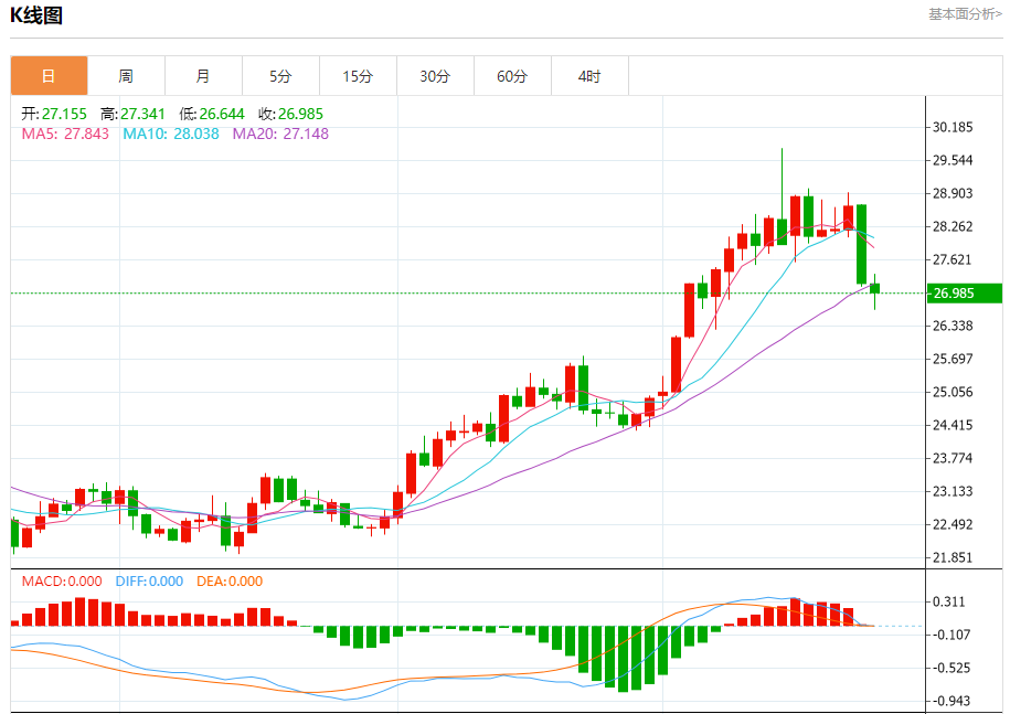 现货白银:截止北京时间20:26,现货白银下跌,现报26.973,跌幅0.70%。纽市盘前,白银价格显示新的负面交易将攻击26.90美元,并试图保持在26.90美元以下,以阻止上午建议的积极情况,并在当天剩余时间内实现更多的熊市修正,为下一个修正目标26.00美元铺平道路。