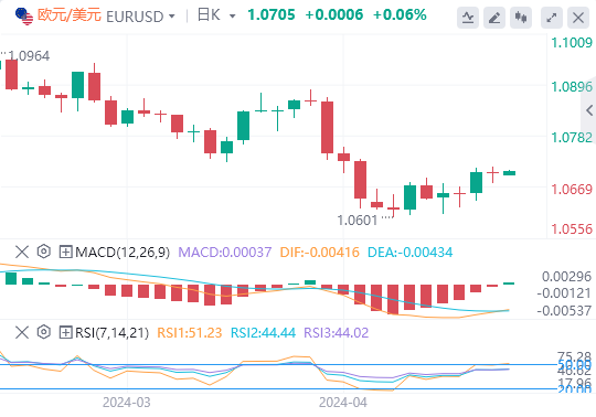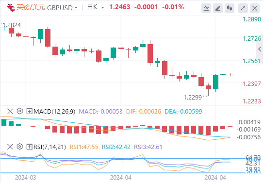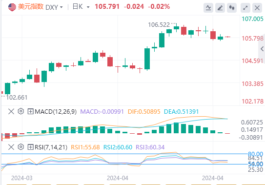 美元指数:截止发稿,美元指数交投于105.791附近。尽管4月份PMI初值疲软,但美联储仍保持稳定的鹰派立场。此外,由于大量供应注入,美国国债收益率持续高企,可能会进一步提振美元。本周的亮点将是周五公布的3月份个人消费支出(PCE)和周四公布的第一季度国内生产总值(GDP)初值。周四的每周初请失业金人数也将受到密切关注。技术面上,日线图上的指标反映了喜忧参半的情况。相对强弱指数(RSI)在正值区域的平坦位置表明购买势头存在,但由于似乎没有明确的方向,因此有些疲软。这表明多头正在施加控制权,但正在努力进一步站稳脚跟。