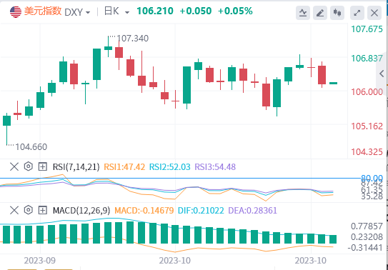 美元指数:截止发稿,美元指数交投于106.21附近。美元在周一交易日下跌至106.10以下的低点,美元走弱是由流动风险驱动的,使其难以收集需求。技术面上,美元指数的技术前景从中性到看跌是显而易见的,这表明多头正在失去动力。RSI在中线以上减弱时指向潜在的反转,而MACD直方图显示出更大的红条。