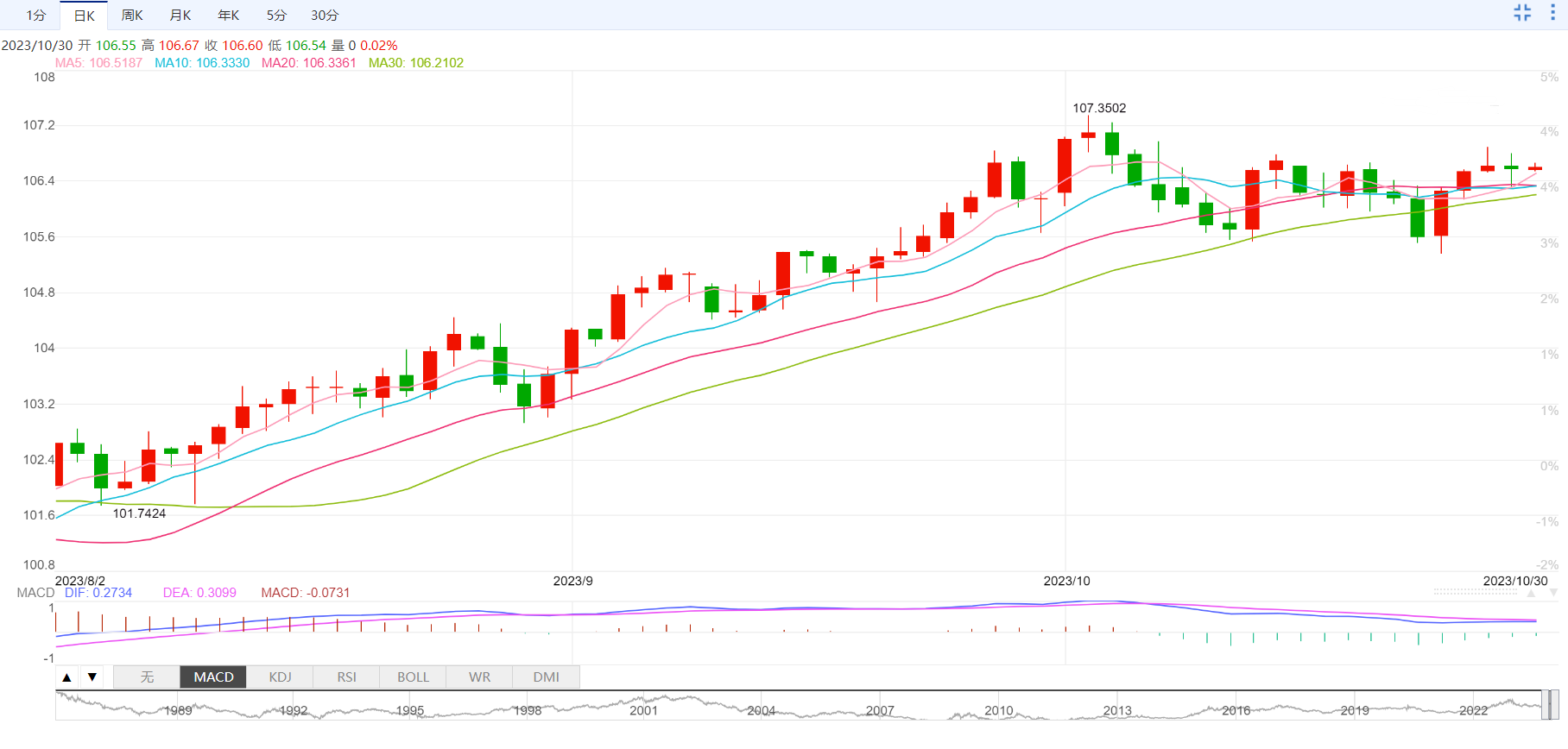 美元指数:截止发稿,美元指数上涨,现报106.59,涨幅0.02%。欧市盘前,尽管美联储首选的通胀指标——美国核心个人消费支出指数(PCE)仍远高于2%的目标利率,但预计美联储将在周三为期两天的会议结束时维持利率不变。美联储官员表示,最近的经济数据表明,经济活动正在稳步增长,而就业市场依然强劲。这些乐观的报告提高了对12月会议进一步加息的预期,这可能暂时提振美元。