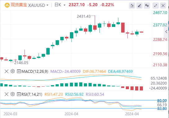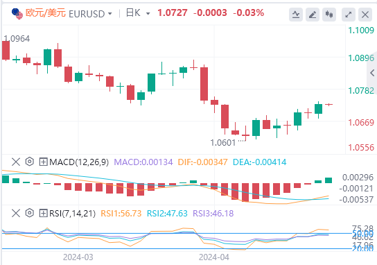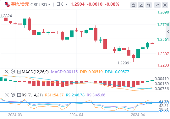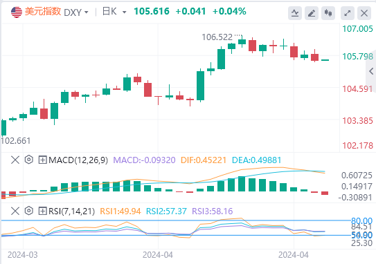 美元指数:截止发稿,美元指数交投于105.616附近。美国经济保持韧性,但由于通货膨胀和利率上升,预计增长速度将放缓。美联储(Fed)的立场仍然坚定,似乎不想急于开始宽松政策,市场鹰派调整为美元提供了缓冲。3月份的个人消费支出(PCE)数据可能会影响这些投资者的预期。技术面上,日线图上的指标描绘了美元指数的喜忧参半。相对强弱指数(RSI)在正值区域的平坦位置与停滞的买盘势头产生共鸣。此外,移动平均收敛散度(MACD)的绿色条线减少反映了看涨情绪的消退,预示着近期可能会出现疲软。