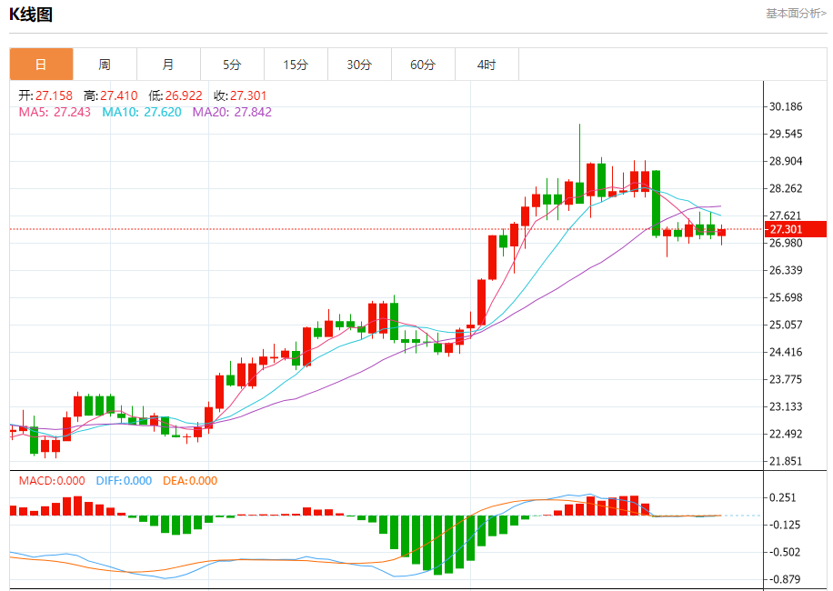 现货白银:截止北京时间20:19,现货白银上涨,现报27.299,涨幅0.44%。纽市盘前,受随机利好的影响,白银价格目前交易积极。技术指标表现出矛盾,导致中性立场,直到某些价格水平被突破。