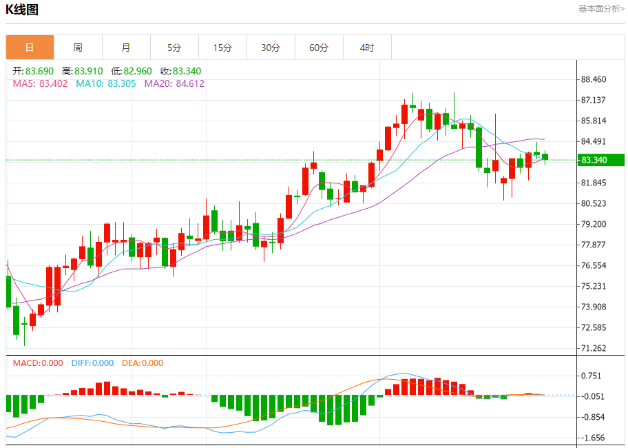原油市场:截止北京时间20:19,美油下跌,现报83.330,跌幅0.60%。纽市盘前,原油价格目前正在测试83.90美元的关键阻力,在即将到来的交易活动中需要谨慎。