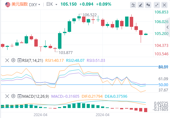 上周五,因美国4月就业增长放缓幅度超过预期,且薪资同比涨幅降温,促使市场增加对美联储今年将降息两次的押注,美元指数一度失守105关口,但随后强势收复大部分失地,最终收跌0.32%,报105.05。截至目前,美元指数报价。