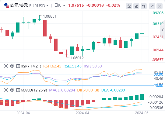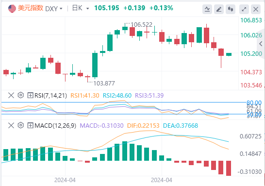 美元指数:截止发稿,美元指数交投于105.195附近。美元指数追踪的美元在过去一周大幅回落,一度触及4月10日以来的最低点。这种抛售主要源于美联储宣布货币政策后美国国债收益率下降以及美国就业数据弱于预期。技术面上,如果下行压力加剧,预计美元指数将在4月9日低点103.88之前的55日简单移动平均线(SMA)104.49处遇到临时支撑。突破该水平可能会暴露暂时的100日均线103.81,其次是3月低点102.35(3月8日)。进一步下跌可能导致测试12月低点100.61(12月28日),领先于心理障碍100.00和2023年低点99.57(7月14日)。