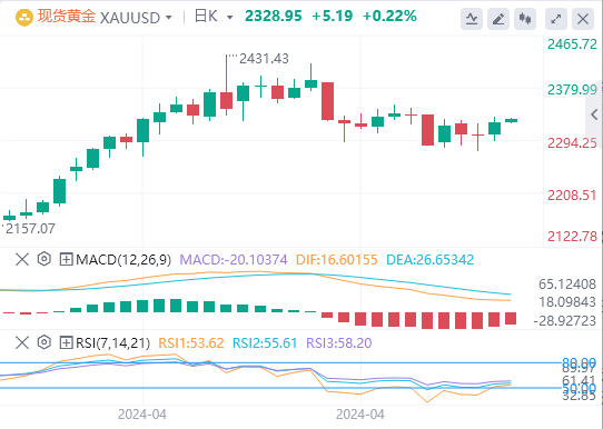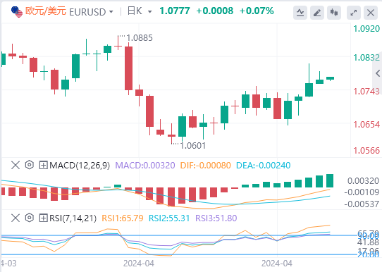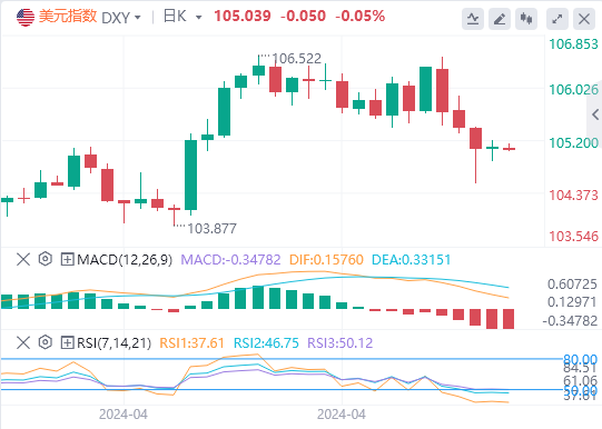 美元指数:截止发稿,美元指数交投于105.39附近。正如美联储主席杰罗姆·鲍威尔所说,持续通胀仍然令人不安地高企,使美元保持稳定。话虽如此,上周五公布的疲软就业报告提供了一些线索,表明美国经济可能正在发出信号,表明美联储开始降息所需的降温已经开始。这可能会引发美元进一步下行。技术面上,日线图上的技术指标反映了美元指数的混合信号。相对强弱指数(RSI)的负斜率和负区域表明空头似乎正在取得进展。移动平均收敛散度(MACD)上升的红色柱线进一步证实了这一趋势,这表明看跌势头