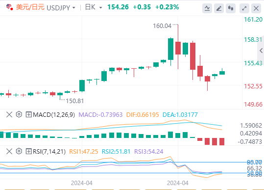 美元兑日元汇率昨日上涨0.6%,今日进一步上涨0.2%,至154.17日元,令市场担心日本当局是否会再次出手干预。交易员估计,日本上周花费近600亿美元来捍卫日元。