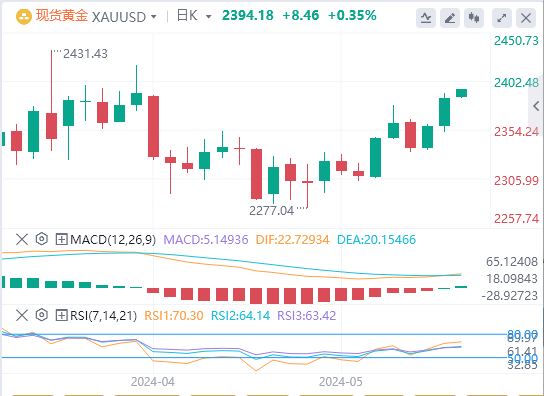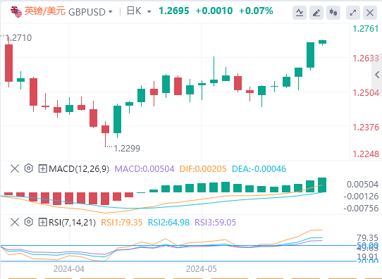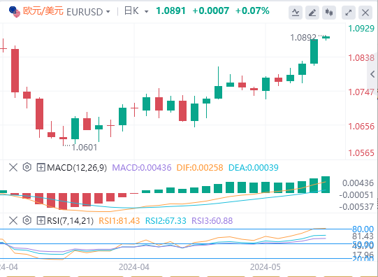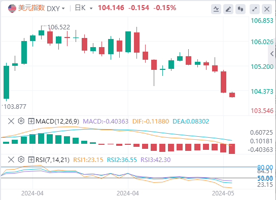 美元指数:截止发稿,美元指数交投于104.146附近。美国经济显示出承压迹象,因为4月份的通胀似乎已经减速。美联储主席杰罗姆·鲍威尔(JeromePowell)的谨慎立场,加上生产者价格指数(PPI)数据喜忧参半,凸显了对未来通胀动态的担忧,这似乎正在打压美元。技术面上,日线图上的指标反映出美元指数的技术面喜忧参半,但在很大程度上倾向于下行。相对强弱指数(RSI)显示负斜率并处于负区域,表明卖势强劲。这表明空头在短期内正在获得控制权。此外,移动平均收敛散度(MACD)显示上升的红柱,表明看跌势头正在增强。